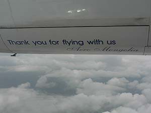 ついでにいえば、今日のフライトは南ゴビ県の県都ダランザドガドへ向かうものではなく、その近郊の別の空港へと向かうようです。あとで聞いたところBulagtaiという名の空港らしいんですが、どうやらツーリストキャンプエリアへの観光客用直行便みたいですね。なお空港の正式名称はチケットにも記されてはおらず、代わりに「TOURIST CAMP, GOB」と書かれておりました。しかしこれじゃゴビのどの場所なのか全然わからないなぁ(苦笑)。さらにTakemaの日記には「ウムヌ(南ゴビ)」と書かれているし、一体どれが本当なのでしょ?