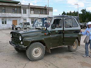 建物の外に出ると、ここ南ゴビ観光の足となるトランスポートが待っていました。それは予想通りラクダ(そんなわけないっしょ)四輪駆動のジープ、しかも勿論それは現クライスラー社製のそれではなく、通称「ロシアンジープ」と呼ばれる「悪路の番長」でありました。