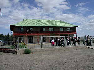 約1.5時間ののち、無事南ゴビへ到着。いやぁさすがにゴビというべきか、久々に見ましたわ地平線まで続く荒涼とした大地(要はナミビア以来ってことね)。360度の視界の中に唯一見えるのは、「空港ターミナル」というべき2階建ての建物と、それに隣接したツーリストゲルキャンプのみ。あとははるか遠くに低い山並み(実際はかなり高いんですが何十kmも遠くですからねぇ)が見えているだけで、まさに広々。