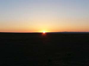 明けてご覧の通り非常にいい天気。そりゃそうだ乾燥地帯なんだから(と思っていたら何と翌日は曇り&一部で雨、だったんです)。日の出は6:45でしたっけ。ちなみにこの旅行中、この日の出時間がどんどん遅くなっていくのを実感し、何となく「秋へと向かうモンゴル」を感じましたわ。