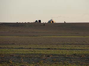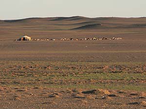 左画像では朝餉の煙が立ちのぼっていてほのぼの。右写真では、家畜たちがゲルの横にずらぁと休んでいるのが見えてます。