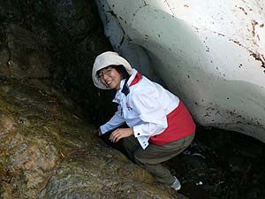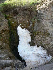 ところでこれ、日本の高山に見られるような雪渓だと思って触ってみたら、固さが全然違います。色は白いですが実態はほぼ「氷」という感じでしたね。急峻な谷の底ですから、冬期間に相当の「圧縮」がおこなわれたということでしょうかね。