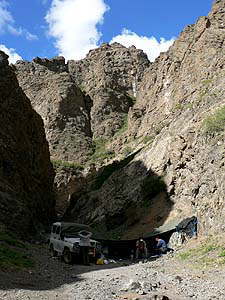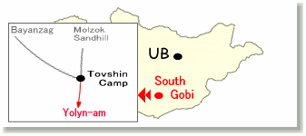 さて本日は、午前中に山中の渓谷?ヨーリンアムを訪問し、戻ってきてご飯のあとは恐竜の化石がたくさん出る(出た)というバヤンザクを往復するという行程になっています。それぞれまたもロシアンジープにゆらり揺られて何とやらというわけなんですが、ちなみにヨーリンアムへは40km*往復=80km、バヤンザクへは55km*往復=110km。午前+午後で走行距離は200km弱、もちろん全てダートですからかなりの「心と身体の準備というか覚悟」が必要なのはいうまでもなし。