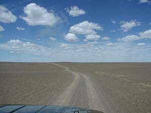 それからはもうひたすらゴビの平原を、地平線目指して進むのみです。しかし、地平線っていつまでたっても近づいてこないのね(あたりまえ)。しかしさすがにそろそろ着かないかなぁと思っていた頃、わだちが小さな丘の上を目指すように上り始め、上りきったところがいきなり「目的地周辺」でした。
