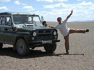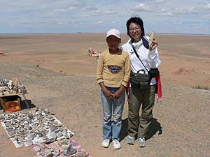 さて、午後2時に午後のメインディッシュ、バヤンザクへと向かいます。バヤンザクは恐竜の化石が発掘されることで知られる場所だということですが‥うーん、片道55km(ちなみにおしんこどんメモには65kmとあるので、もしそっちが本当ならもっとキビシイのね)はやっぱり遠いなぁ。しかし昨日のモルツォグ砂丘、午前中のヨーリンアムとでロシアンジープにも(半強制的に)慣れてきたような気がします。要は覚悟と体力さえあればそんなにしんどくない?(笑)。