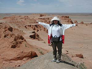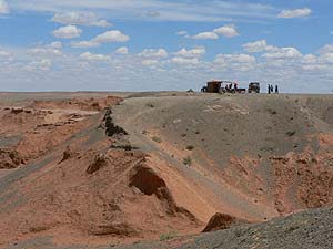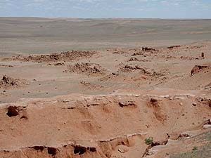 ここバヤンザクはゴビの大展望が有名、いやいや、サブタイトル通り恐竜の化石が出る場所として一部の専門家の方には有名な場所のようです(もちろん門外漢のTakemaは調べるまで知りませんでしたが)。この赤い地層は平原の下に広がる古い地層なのでしょうが、ちょうどこのあたりは地形的に大きな段差があり、それ故浸食と共に土壌に埋もれていた化石が出やすい場所なのでしょう(もっとも化石が出る場所はここから少し離れた場所らしいですが)。ま、われわれは恐竜化石の発掘に来たわけではありませんからここで十分。はるか古代に思いを馳せるには十分すぎる場所ですしね。