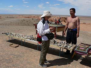 「せっかくだから一つは欲しいよね。」これがわれわれの偽らざる心情でした。そこで、化石には少々うるさいおしんこどん(毎日仕事で顕微鏡をのぞいてます)、見る目は確かですから(ホント?)、結果として見れば見るほど悩んでしまったようでした(大笑)。いやぁなかなか「これ!」と決められません。そのうち、(もともと商売っ気のない)旦那さんは、ドライバーのシャガさんと「別世界」へ。ん、ちょっと待て、あまり気にしていなかったけれどよく考えてみれば‥