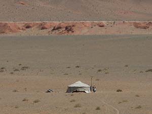 はるか遠く、こんな場所にも遊牧民のゲルがありました。水を汲む井戸はどこにあるのでしょうね。