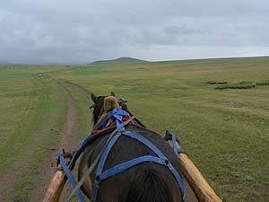 雨ゆえ乗馬目当てで来ている皆さんの多くは宿で沈殿のご様子。でもこんなふうにぽっくりぽっくり揺られて行くのもなかなかいいものです。丘に登っていくと道のオボーがあったりして、「ああ、ここもただの草原なのじゃなくて人の営みがある場所なんだな」とあらためて思わせられます。はるか遠くにはナライハの町が見えたりして、風情は満点。