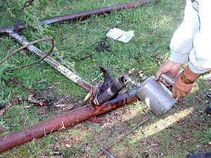 そして翌朝のことです。何やらゲルの外、昨日羊の解体が行われた場所のあたりから「ゴォーッ!」とバーナーを使っているような音が聞こえてきました。行ってみるとやはりバーナーの炎だったのですが、何を焼いているのかと思ったら、何と昨日の羊の頭部でした。聞けば、羊のほおの肉は絶品なのだとか。うーむ、徹底的に食べ尽くすのね。