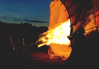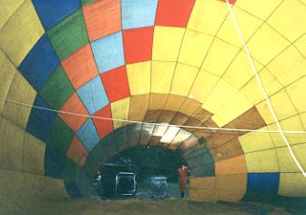 さすがに天気が悪いと飛ばないこの熱気球ですが、幸いなことにこの日の朝はとてもいい天気。まだ暗いうちにスタート地点まで移動し、上の写真のようにエアを入れ、浮きそうになってきたところで乗船。クルーを入れて全部で9人も乗っているのによく浮き上がるもんだ、とただただ不思議。