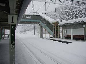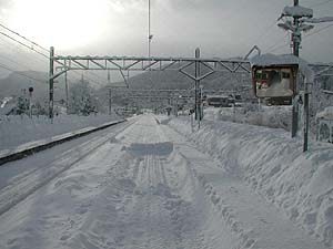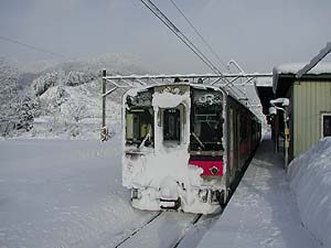 車で駅まではほんの数分。送って下さった宿の方にお礼を言って待合室に入りますが、無人駅ゆえ暖房もなく寒いです。こりゃ列車が来なかったらしんどいなぁと思いますが、雪の降り方が強まる中、列車はほんの数分遅れで無事やって来ました!すごいぞJR!(と、この時はそう思っていました)