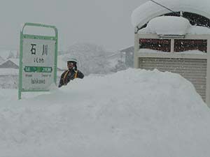 石川駅付近は吹雪に近かった‥保線職員の方、雪の中のお仕事ご苦労様です。