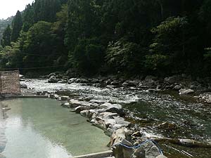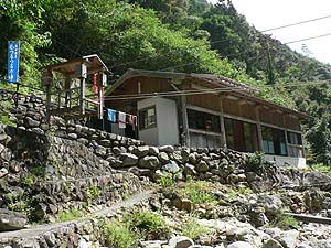 ちなみに、すぐ下流には別の温泉浴場がありまして、そこからはこちらが丸見えだったということをここに付け加えさせていただきます(笑)。ま、お客さんはいなかったようだし、管理人さんに見られたくらいだったらまぁいいか(開き直り)。ただ、あちらの湯(出谷温泉浴場)はさらに下流からの引き湯ということですから明らかに別の源泉なんですよね。