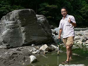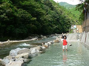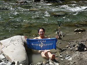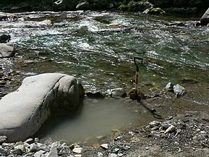 しかもこちらは流れに近いぶんかなり掘りやすく、スコップひとすくいで結構な量の砂や石を掘り取ることが出来るんです。こりゃいいやというわけでどんどん掘り進めます。また、川の水が微妙に流れ込む位置なので湯温調節も簡単です。時間さえあれば絶妙の野湯が出来るのは必定、しかし一応人を待たせているという現実もあり、とりあえず腰まで浸かれるくらいまで掘り進めたところでまぁこんなもんでしょと妥協(笑)。勝手に「涙の湯」とネーミングしたことは言うまでもありません(半分ホント)。
