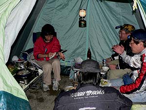 さて、何といっても雪が残るここ木地山でのオフ会ですから夜は当然冷えます。おっと、聞けば昨日テントを張っていた八幡平エリアでは朝になって霜がおり、バイクのシートが真っ白になっていたのだとか。まぁそこよりはマシかもしれませんがそれにしても冷えるのは当然の助動詞べし、というわけで、この宴会部屋付きテントがいよいよ本領を発揮することとなりました!