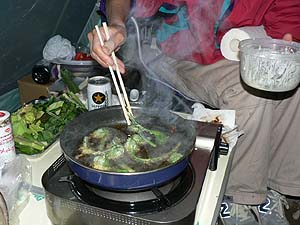今日のメインディッシュは、何と「天ぷら」。キャンプに天ぷらとはなかなか珍しい取り合わせですが(というか油の始末の関係でなかなか大変だと思いますよね)、Takemaオフ会2005でほんやさん&ゆうさんがトライ&成功しているのを拝見し、「よし、今度のキャンプでは必ず!」と思っていたわけです。結果は大成功、美味しかったですよね皆さん?その他ハタハタを焼いて食べたり、もちろんお酒はたーっぷり。楽しき宴会となりました。