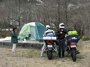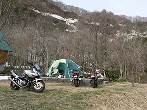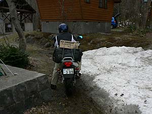 明けて翌朝、皆さん元気に出発準備を始めました。雄叫んだとおぼしき人も、ちょっと準備に手間取っていたみたいでしたけれど元気でした(笑)。皆さん大型バイクゆえ残雪のすぐ脇のぬかるんだエリアではちょっと後輪を空転させながらも、しっかり通過させていくところはさすがです(あ、自分も大型バイク乗りだってこと忘れてる?)。