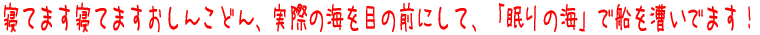 海が見えたところまでそのまま寝てもらい、よく見えたところまで来て「海だよ!」と驚かせてみたのですが、「おおぅ海だぁ!‥海だね‥海だねぇ‥zzz‥ZZZ!」