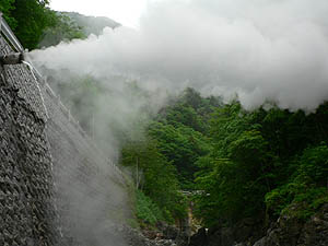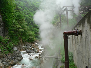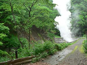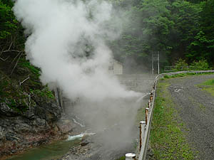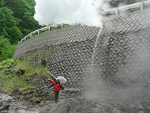 話が全然関係ない方向にそれちゃいましたが、お湯の話に戻しましょう。道路の下に埋められたパイプの先から常に湯気が噴出しています。ちなみにこの噴出とともに高温のお湯が少量出ているわけですが、その噴出は一定ではなく、時には対岸まで蒸気が吹きつけられ、それとともに熱湯が雨あられのごとく周辺に降り注ぐということですから決して油断はできません。で、まずは河原に降りてみると‥