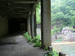 で、この旧道沿いにガス抜きの排出口があるわけです。その昔この付近(安房トンネル工事現場)で水蒸気爆発が起こり、そのため(だったか)安房トンネルの出口付近は計画を大幅に変えて現在のルートになったわけです。安房トンネルの松本側出口付近が妙に強引に曲げられているのはそのためなんですが、この旧道から見て対岸の上部には、結局使われぬまま放置されることになった橋脚の柱が何本かさびしく取り残されているのが見えます。