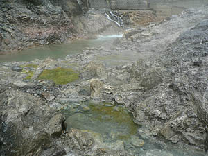ちなみにおしんこどんが立っている場所は明らかな危険地域です。今この瞬間に大噴出が起こったら熱湯地獄間違いなし(出なくて良かった)。で、パイプから落ちている湯はといえば下の岩場付近に三々五々思い思いに流れ落ち‥
