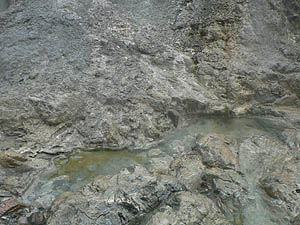 その一部は、岩のくぼみにたまっているではありませんか。さわってみるとなかなか適温です。しかし問題は、このくぼみ自体が微妙に危険エリアと思われる範囲にあるということ。直撃は受けないにしても熱湯シブキくらいは食らいそうな場所にあるわけです。どうしよ?