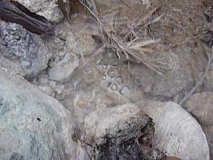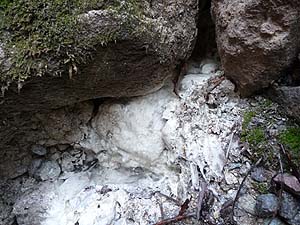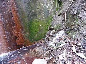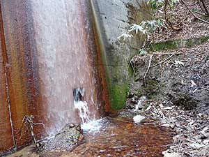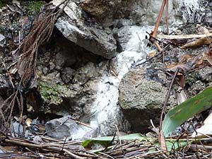 喜び勇んで近づいていくと‥うむ、これはやはり硫黄系の源泉で、湧出量は1-1.5リットル/分という感じで大した量ではないですが、なめてみるとしっかり酸味を感じる個性の強い源泉です。しかし悲しいのは温度が低い(沢の水温と同じくらい)ことで、これではいくら源泉を溜めても入りたいとは思いませんねぇ。