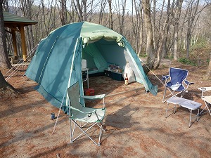 ほぼ日の出とともに起き出して、湯沢ICで高速を下り、ちょっと買い出し&寄り道をしたりしてじゅんさい沼キャンプ場には8:00に到着しました。すでに前夜のうちに到着していたおとうと「いやいやまぁまぁオハヨーございます」と挨拶しながら、「1年に1度しか使わない(ことの多い)宴会場付きファミリーテント」を設営します。