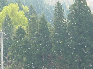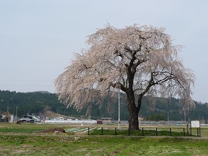最初の寄り道は、知る人ぞ知る?ローカル名所「おしら様の枝垂れ桜」。数年前に「手を入れすぎた」結果枝張りが小ぶりになってしまったというアレですが(左上画像にマウスオンすると2007年の画像に変わります)、今年はもう散り始めということもあってか案内表示も全くなし。そのかわり、吹く風に桜吹雪が舞っておりました。これはこれでまぁいいかなと。