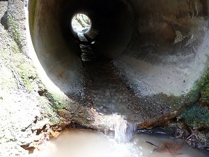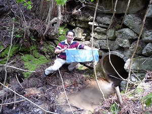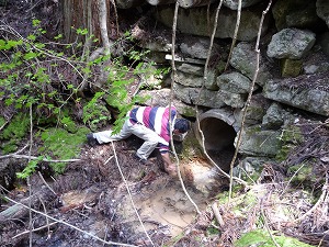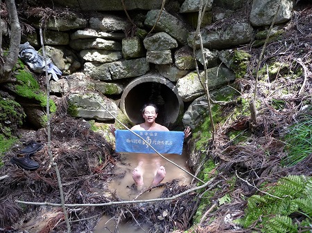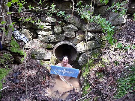 コンクリ管から湯が流れ出ています!これより上流には人的施設はありませんから廃湯でないのは当然です。また、コンクリ管の出口付近は多少深くなっていて、多少の堆積物を手で掻き出すだけで腰湯OK、これはコレハ!という感じで「入浴」を宣言。同行のおとうは激しく笑っておられました(笑)。