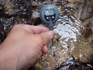 上流からそこそこの量の湯が流れてきています。湯温は‥うーむ絶妙の43.2℃!(温度計は今回からの新装備)。