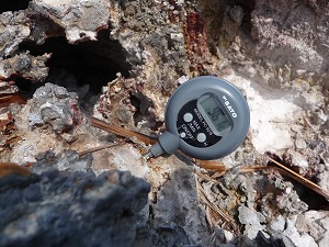 おお、96.1℃!まさに激熱高温の噴気ではありませんか!(別の穴では97.6℃を記録)