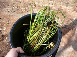 せいぜい5m四方くらいの範囲は、もうとにかくワラビの里状態!というわけで大きめのものを中心に3人でしばし収穫。「ここだけ」密集していたのは、やはり地熱の関係で元気に根を張っているからでしょうかね。上の方の画像で黒いバケツに入っているのがこのワラビです。その他、いつもの場所でゼンマイも少々収穫しました。
