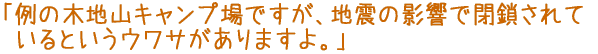 というお返事が返ってきました。うわーマズイ、今回はおとう、ちんさん、のらさんと合わせて5人でキャンプ宴会しましょという話になっているんですが、すでに皆さんには「木地山で会いましょう」と連絡しちゃっているし‥。