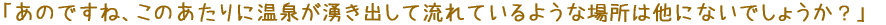 さて続いては某所の湯へ。今年の湯加減はどうかなー、でも面倒だからスコップや携帯湯船は持参していないんだよなー、つまりはこの湯にそれほど固執してないんだよなーと思いつつも、なぜか懸命に「今年の適温場所」を探すTakemaでありました。すると‥