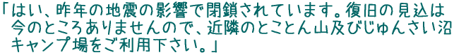 おまけに代替のキャンプ場といっても、とことん山は以前見に行ったらかなりのファミリーキャンパーがいた記憶があるし、温泉付きを目指すキャンパーはこちらに殺到すること請け合い。となればじゅんさい沼しか選択肢はありません(一応東北の他エリアについても調べてはみたんですがどこもイマイチだったので)。いつも道路から見ていて「じゅんさい沼=雰囲気が暗い」というイメージがあったせいか(というか木地山が開放的すぎるんですが)あまり積極的にではありませんでしたが、今年はこちらのキャンプ場を利用することに。しかーしこの選択が何とも大正解でありました!
