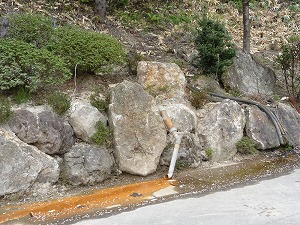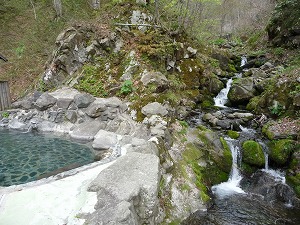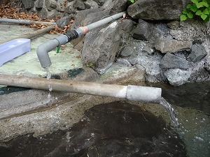 メインの湯は左上画像のように岩組みのなかから、そして2本の塩ビ管も(うち1本は多少湯温が低かった)。