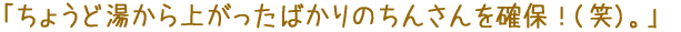 いや、なぜかと考えても野暮でしょう。とにかくちんさんがすでに「入浴の悦楽」モードに入っているのは事実のようです。いやーそれにしてもびっくらこきましたわ(笑)。