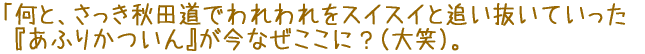 さてこの後は阿仁方面に向かいますが、さすがGWというわけでこの国道もかなり交通量が多くなっているようです。どこかにパンダ車が隠れているかもと思いつつ安全運転に徹しながら進んでいくと、上小阿仁村の市街地に入ったところで脇道から出てこようとしていたパンダ車を期待通り発見!(嬉しいんだか悲しいんだか)。でも「数台後ろにパンダがいる」というのは精神衛生上あまりいいものではありませんので、上小阿仁道の駅の分岐信号から県道214号、通称「くまげらエコーライン」方面に右折しました。パンダさんはそのまま直進、さよーならー♪大名行列渋滞を作らないでねー♪