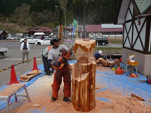 あれま、チェーンソーで彫刻を作ってます。ノイズがすごいのが難点かな(笑)。