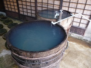 さて内風呂入浴もそこそこに、ほんの数mとはいえ公共通路を通るために「最低限の服を着て」露天の樽風呂に移動です(「最低限」がどれほどのものであるかはご想像にお任せします。ただ、男湯脱衣場から「左右の安全確認」を行ってから移動したのは事実です)。