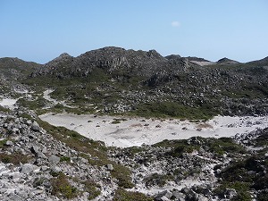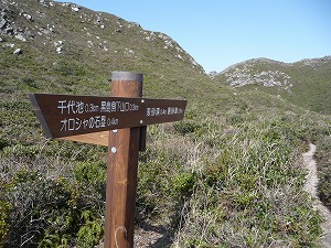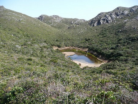 この池が千代池(せんだいいけ)です。それにしても、池はもちろんのことですがその奥にある山のごつごつした感じを見ていると、まるで「ここはどこ?南アルプスの南部のどこか?」と錯覚してしまうほどです(Takemaだけかも知れませんが)。少なくともここが外周たった22kmの島の中だとは思えません。何だか「神々の遊ぶ高天原(たかまがはら)」といった世界ですね。このあたりは風もさほど吹かず(山肌を吹き上がった風はそのまま天空に巻き上げられてしまい台地には直接入り込まない)おだやかな気候なのか、周囲には樹木が生い茂っています。さーてそれでは池に向かって降りていきましょう。