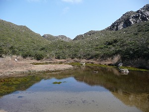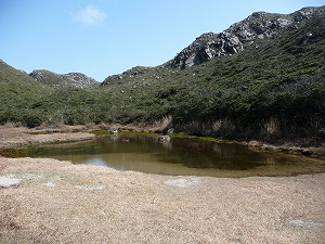 さて上記の地図をご覧になるとおわかりかと思いますが、この「文政の石積跡」のすぐそばに「千代池(せんだいいけ)」という場所があるようです。また、この池の他にも頂上台地には少なくとも3つの池があることがわかります。これらはみな火口の跡に水がたまったものだそうで、そう簡単には涸れそうにありません。何でも、この頂上台地の凹みに溜まった水は川となって流れ出すことがなく(当然)、そのため地下水となって浸透し海岸近くで湧き出ているのだとか。なるほど、だから離島なのにそれほど水に困らないというわけです。