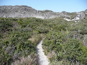 また、南西方向には眼下に神津島村の集落が見えていますが‥その方向の斜面はかなり崩落が進んでいて(右上画像マウスオン)、将来的には大規模な防災工事も必要になってくる気がしないでもありません(下流部分ではすでに工事が行われている気配がありましたが)。