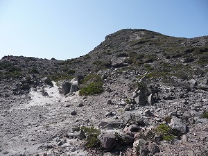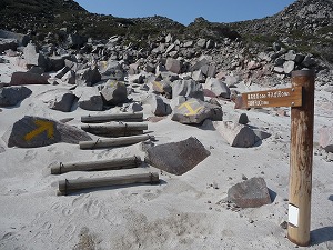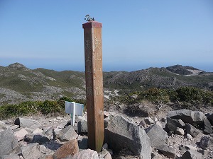 なお画像はありませんが、頂上直下には「不入が沢」(はいらないがさわ)という「聖地」が見えています。そこはこのページの上の方で書いた神々の水をめぐる会議が行われた場所だということで、「ババア池」方面に向かう登山道もその場所を避けるように道が付けられ、かつロープが張られて中に入れないようになっています。特に何があるようにも見えませんでしたが、よい子の皆さんはロープの中には立ち入らないようにしましょうね。