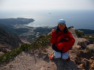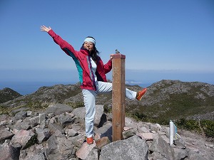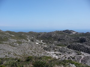 何だかとても雄大な風景で、ここが離島であることがにわかには信じられなくなりますが、頂上に近づくにつれて周縁の山々の向こう側にどんどん海が広がってきました。そして頂上に到着です!