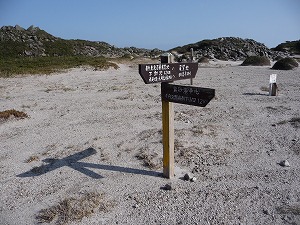そんなわけでほぼ平坦かつ固い砂地で歩きやすいことこの上ない道を進んでいくと、新東京百景のポイントに到着しました。前述したとおりこの日はやや空が霞んでいたのですが、ここからは神津島より北に位置する島々を眺めることができます(右上画像にマウスオンすると島の名称を示した画像に変わります)。でもこれらの島々は頂上からも見えていたんですよね。特にここが一番の好展望というわけでもないような気がしますが(ぶつぶつ)。
