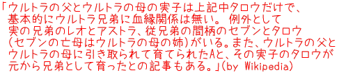 何と驚いたことに、ウルトラ一族もものすごい複雑な家族関係の中で頑張ってきて、普通なら自分たちのことで精一杯のはずなのにわざわざ出稼ぎじゃないけれど地球までやって来て怪獣をぶっ倒した上で毎度自宅に帰っていたという、ものすごくボランティア精神にあふれた方々だったわけです(驚)。しかも「血縁関係がなく」「見返りを求めない」ということから考えると、これはもう「宇宙NGO」そのものであるはずです。というわけでこの勝負、一方的にウルトラグループの勝ち!(いつの間に勝負してたんだっけ?)。