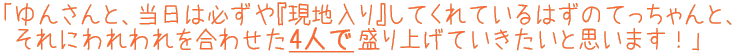 さてここで話を戻しましょう。実は2010年1月、Takemaがゆんさんに「共催の提案」をいたしました。ゆんさんがこの申し出を快諾して下さったことで、今こうしてこのような共催オフキャンプのお知らせをすることができているというわけです。ゆんさん本当にありがとうございます!